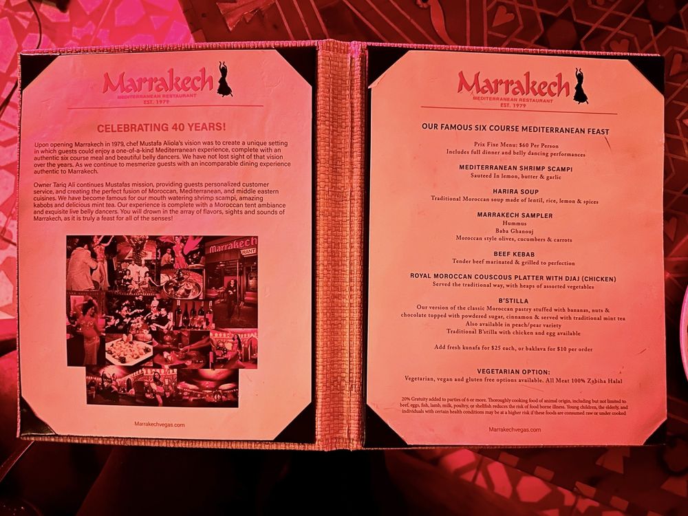 Introducing Marrakech, a Mediterranean-Middle Eastern restaurant located at 3900 Paradise Rd STE Y in Las Vegas, NV. Marrakech offers a variety of dining options including Pescatarian and Vegan choices. The restaurant provides a cozy and intimate atmosphere with outdoor seating available. Guests can enjoy happy hour specials, full bar service, and even catering options. Marrakech is family-friendly, offering options for both adults and kids. The menu showcases flavorful dishes that will transport you to the streets of Marrakech with each bite. Don't miss out on the opportunity to experience the diverse flavors and vibrant ambiance of Marrakech.